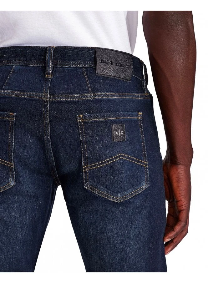 Armani Exchange slim fit jean featuring stretch, 5 pockets, metal branding.