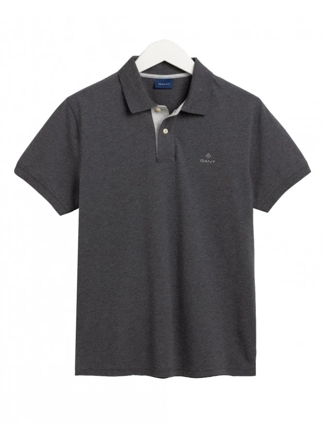 The Gant Contrast Collar Pique Polo in Antracit Melange has short sleeves, a Flatknit collar and the Gant logo embroidered on the chest.