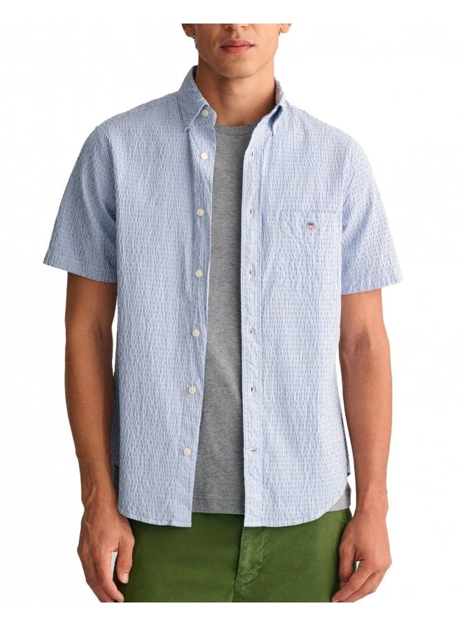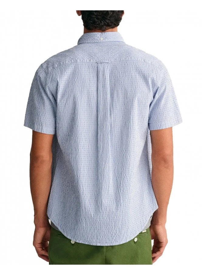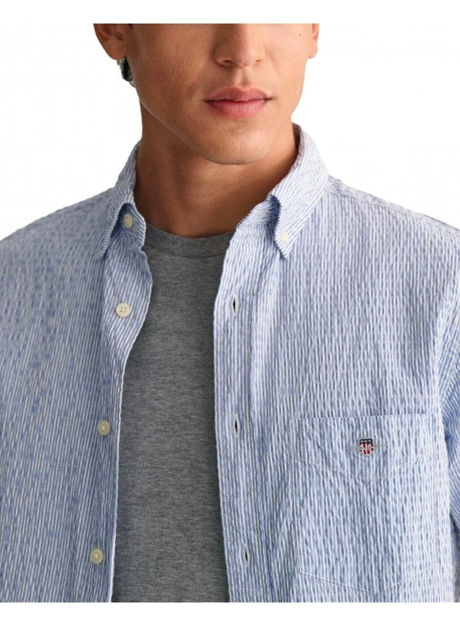 Fashioned with a weaved seersucker striped design, this shirt is cut for a regular fit and features a classic value-down collar. Adorned with a GANT shield graphic at the chest pocket, the design also includes a curved hem and a box pleat with our signature locker loop at the back.