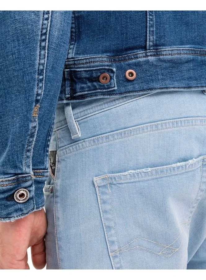 Jacket made of 12 oz deep blue power stretch cotton blend denim aged 5 years with a stonewashed medium wash tone. With abrasions along pockets edges and at the hem, the garment is characterized by the scrapings treatment which creates small localized breakages and contrasting colours on used areas. The item is enhanced by the fastening with values