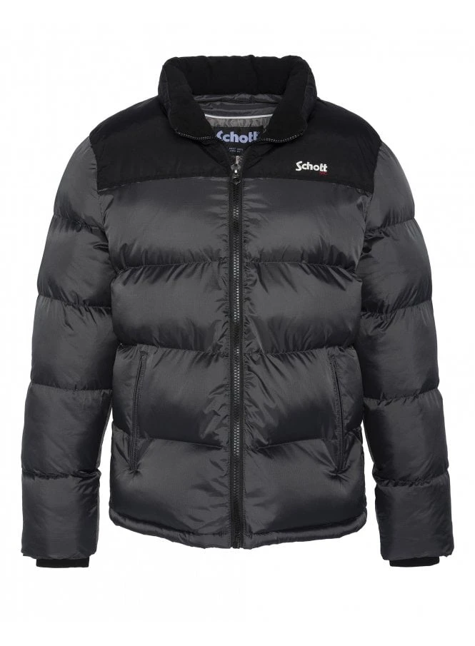 Schott quilted puffer jacket in Anthracite made from lightweight material, concealed hood, interior pockets and full zip fastener